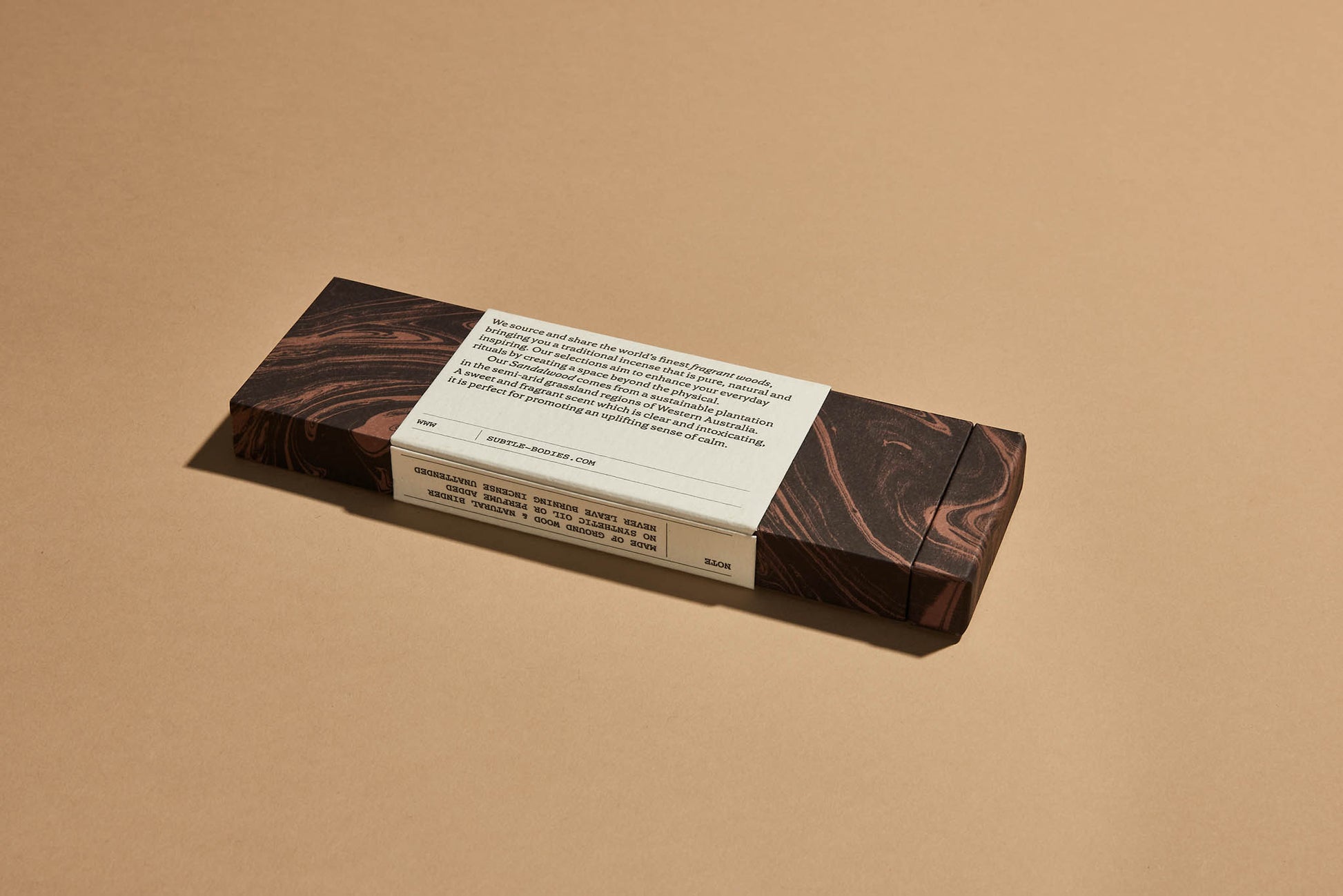 All Subtle Bodies incense sticks are pure wood products with no added perfume or fragrance. Each burns with a heavy, yet delicately scented smoke trail.